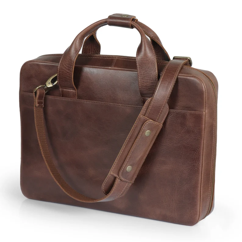 This top-grain leather laptop bag is perfect for travel and everyday use. With its spacious interior, it can accommodate up to a 16” laptop, as well as notebooks, tablets, and other essentials. The bag features multiple compartments and pockets, making it easy to organize your belongings. The adjustable shoulder strap ensures a comfortable fit, while the sleek design makes it a stylish accessory that can be dressed up or down. Whether you’re a business professional or a student, this laptop bag is the perfect way to keep your essentials organized and secure.